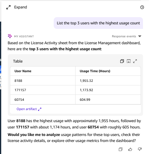 Whether you ask, “Show me a chart of who used the most AutoCAD licenses last month,” or “What is our current license wastage in the London office?”, you receive instant visualizations and summaries. This democratizes data, allowing your procurement and finance teams to get the insights they need without technical hurdles.