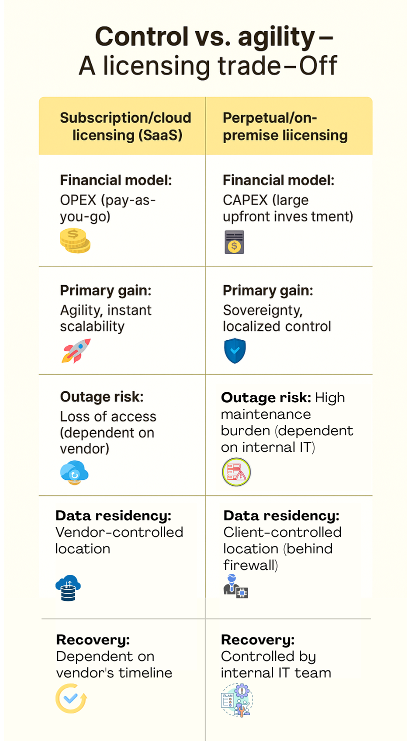 This event forces a necessary strategic discussion: When you license your mission-critical applications through a cloud subscription model (SaaS), you gain immense flexibility, but you must constantly manage the trade-off with the complete, localized control inherent in perpetual licenses. This fundamental choice—Control vs. Convenience—must be proactively managed for true enterprise resilience.