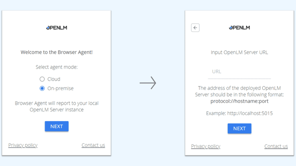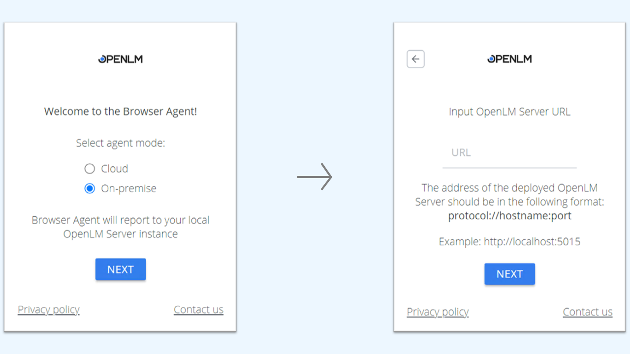 For the on-premise instance: provide the OpenLM Server address and click Next. If Identity Service is not used no authorization file is required, thus, proceed to step 3, otherwise follow Step 2.