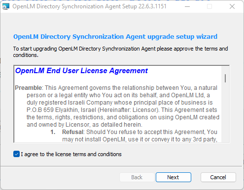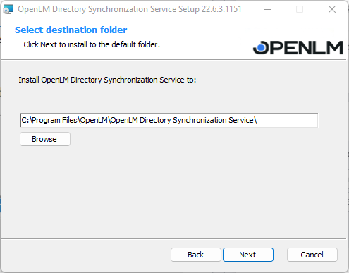 5. You can change the installation folder if you want. The default one is C:Program FilesOpenLMOpenLM Directory Sync (DSS) Service . Click Next.