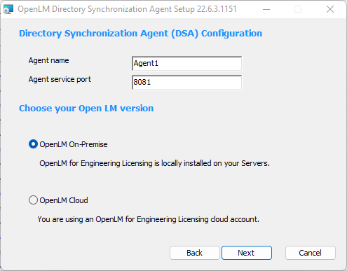 3. Enter a descriptive name (no spaces allowed) to recognize the Agent instance and the details of the DSS installation (found in the Directory Sync UI → Service Configuration tab under DSS Server), then select your Server version: On-premise or Cloud. Click Next.