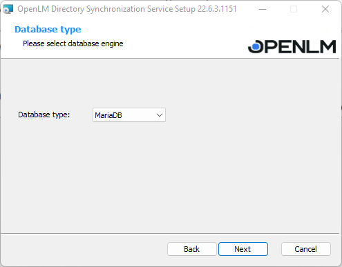 3. In the next prompt you will be asked to select the database type that you want to use. Select it from the dropdown list and click Next. If you are upgrading and require to migrate data, go to step 4.2
