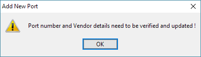 - Click [+Add Port] above the navigation panel. A new port node is added and the Add New Port dialog opens warning to update Port Number and Vendor detail (see Figure 12).