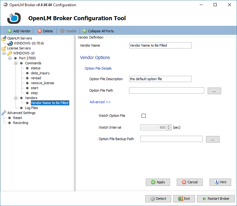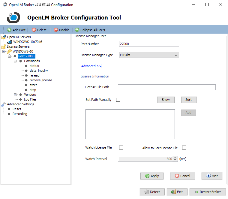 The Detect feature can be used to automatically detect license manager information and simplify OpenLM Broker configuration. The function will add information for new ports (e.g., commands and paths) depending on what is detected. This is useful for clean setups or detecting new license server information. Existing information is reserved and edited ports are not updated with default information.