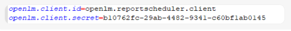 | openlm.client.id=openlm.reportscheduler.client | Configured automatically from Identity Service web UI when a user connects Identity Service and Reports Scheduler | Report Scheduler's credentials for a secure connection. |