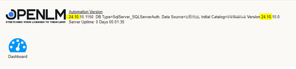 - Please verify that the OpenLM SLM and database version match from the EasyAdmin Background by putting your cursor over the version shown next to OpenLM logo.