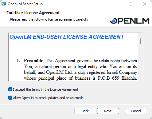 - “Allow OpenLM to send updates and news emails” will ensure that you receive OpenLM news and updates and support webinars approximately once a week. You will receive the emails at the address provided later on the “Activation” screen.