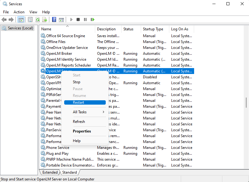- Navigate to the Windows Services and look for the OpenLM Server Service. Click Stop the service.