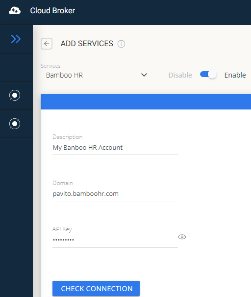- Add Credentials: In the OpenLM Cloud Broker dashboard, find the BambooHR integration and enter domain and API key.
