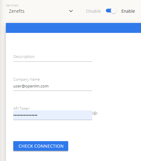 OpenLM Cloud Broker ダッシュボードで Zenefits 連携を選択し、API キーとクライアントシークレットを入力します。