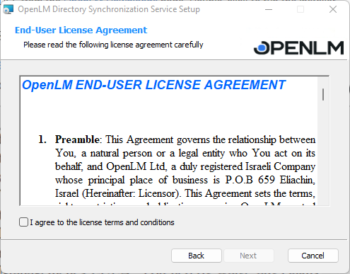 1. You can change the installation folder if you want. The default one is C:Program FilesOpenLMOpenLM Directory Sync (DSS) Service . Click Next.