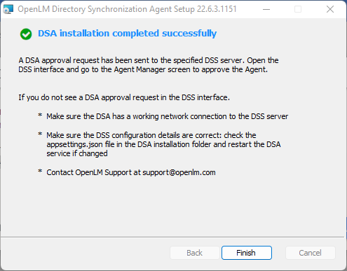 1. Once the setup is complete, click Finish. At this point, a DSA approval request will have been sent to the DSS. You need to open the DSS user interface and go to the Agent Manager tab to approve it.