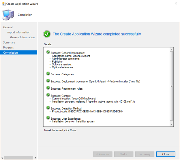 At this point, the creation of the installation package is complete. It will be available in the SCCM console listing under Software Library > Overview > Application Management > Applications.