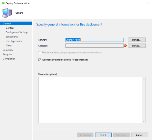 Figure 24: "Deploy Software Wizard" - specify general information for this deployment screen. - Click the [Browse] button to the right of the 'Collection' field - the "Select Collections" screen will appear. By default User collections screen is opened (Figure 25).