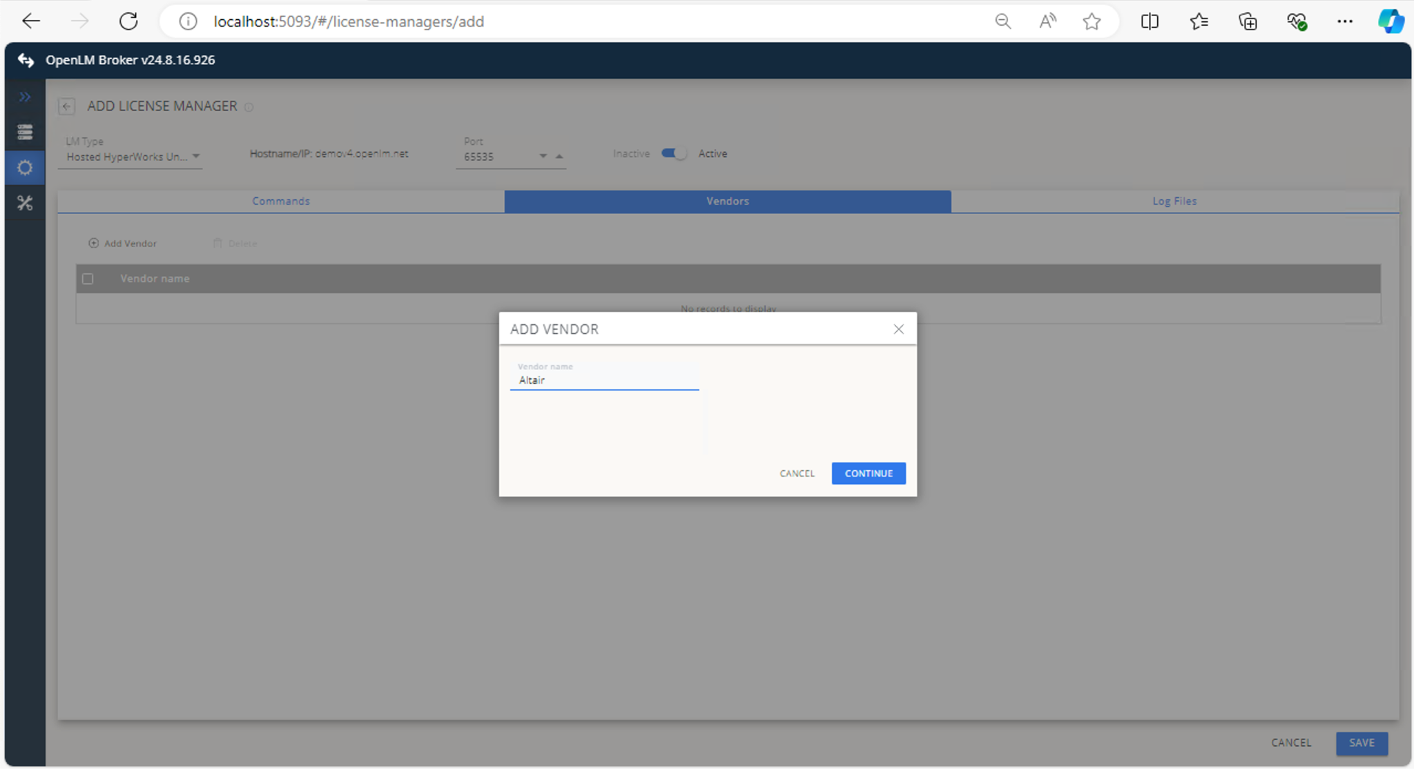 5. In Vendors, click Add Vendor, enter Altair, and click Continue.