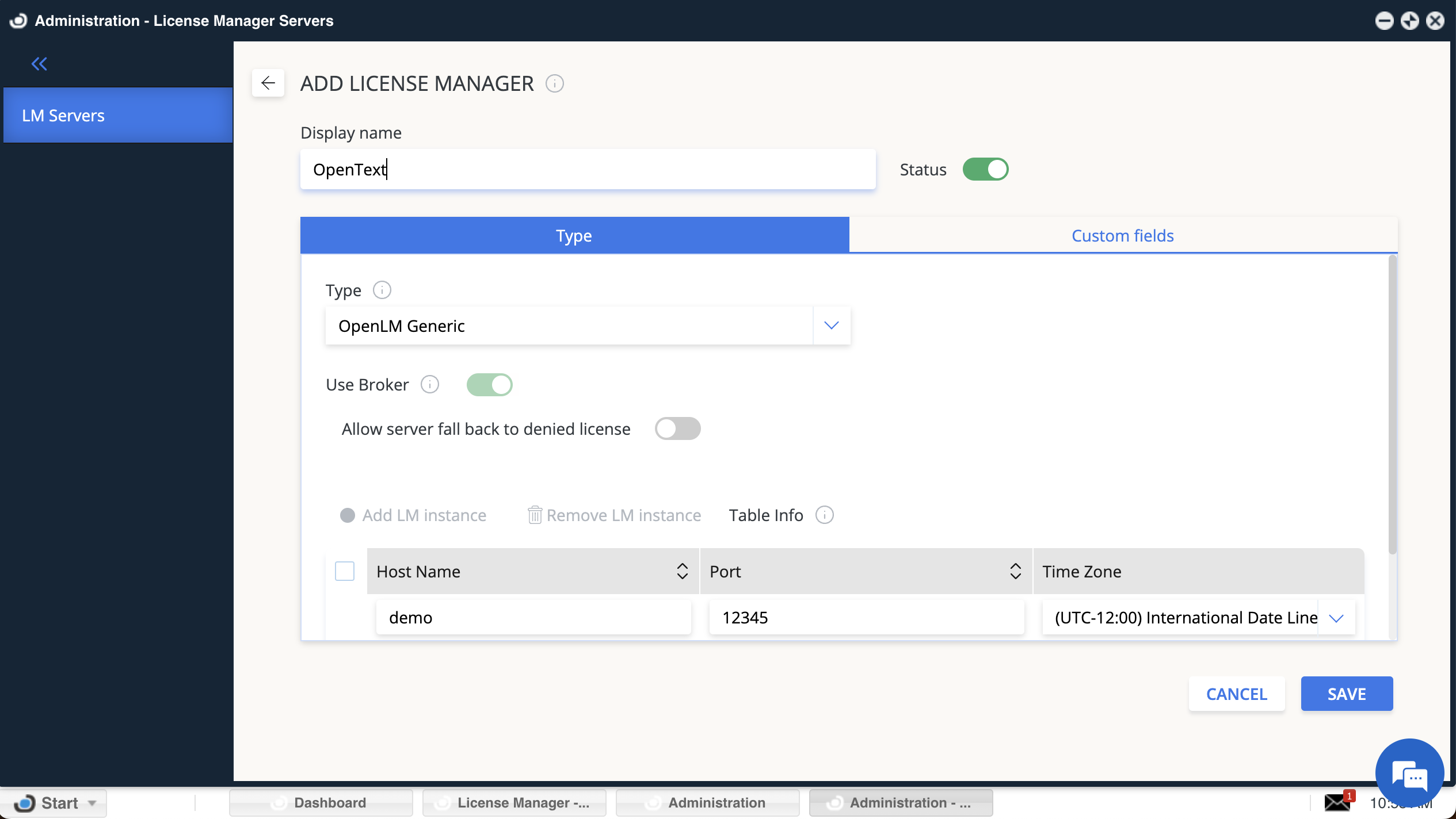 1. In EasyAdmin → Start → Administration → License Manager Servers, click Add LM.