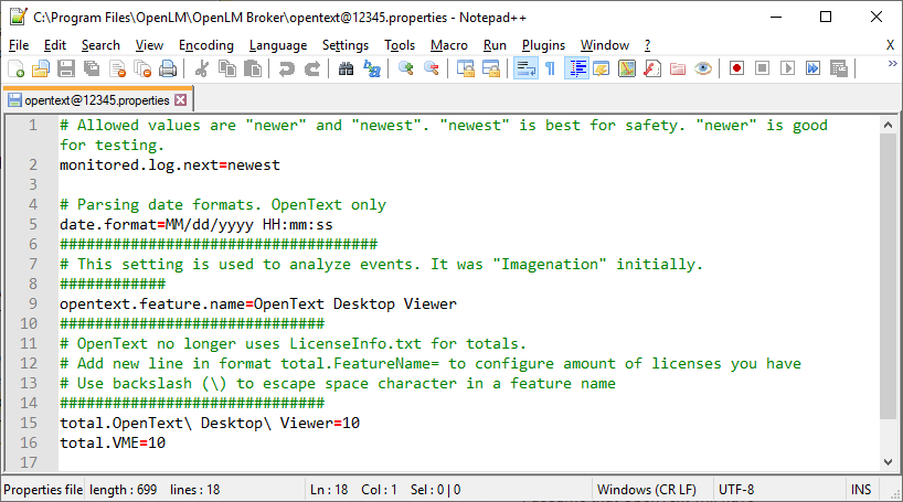 • total.<FeatureName>: total licenses for that feature (e.g., total.OpenText Desktop Viewer=10).