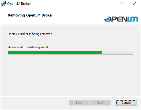 As this is a silent uninstall, there is no additional user input. Uninstalling will leave the configuration files for OpenLM Broker intact and these must be deleted manually. They are left so that the OpenLM Broker can be reinstalled without losing previous configurations. They can be found by default in C:Program FilesOpenLMOpenLM Broker (#).
