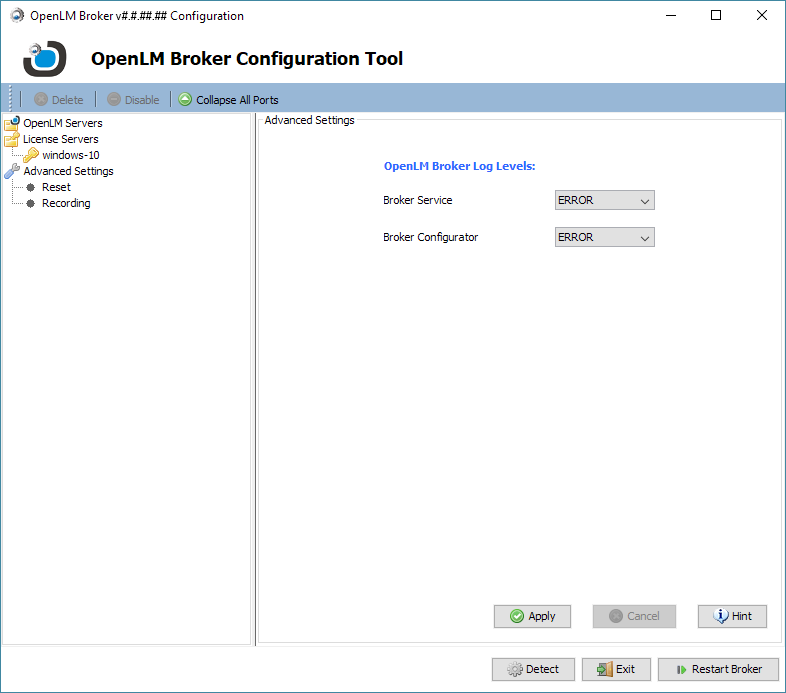 1. Click on the Advanced Settings node in the navigation panel of the OpenLM Broker Configuration Tool to display the Advanced Settings panel (see Figure 37).