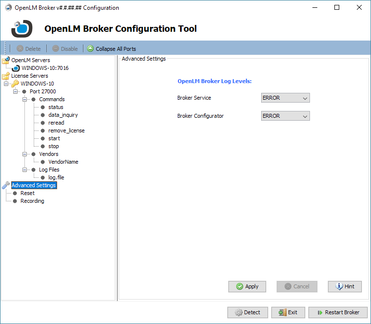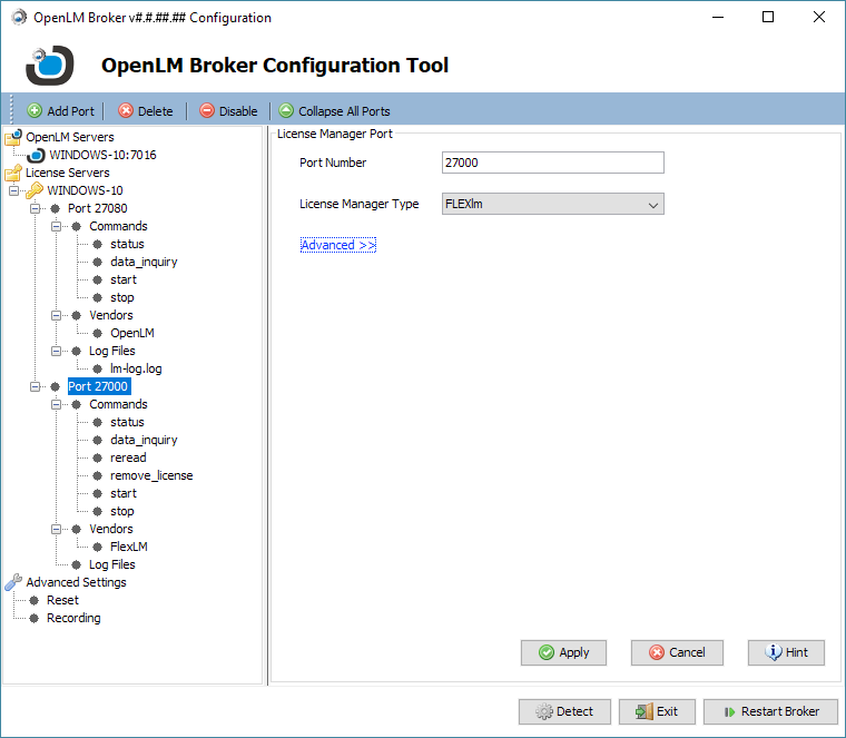 The Detect feature can be used to automatically detect license manager information and simplify OpenLM Broker configuration. The function will add information for new ports (e.g., commands and paths) depending on what is detected. This is useful for clean setups or detecting new license server information. Existing information is reserved and edited ports are not updated with default information.