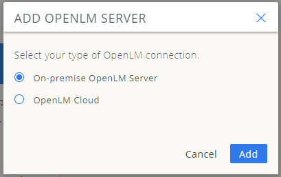 - Select the Type of connection On-premise or OpenLM Cloud and click Add: