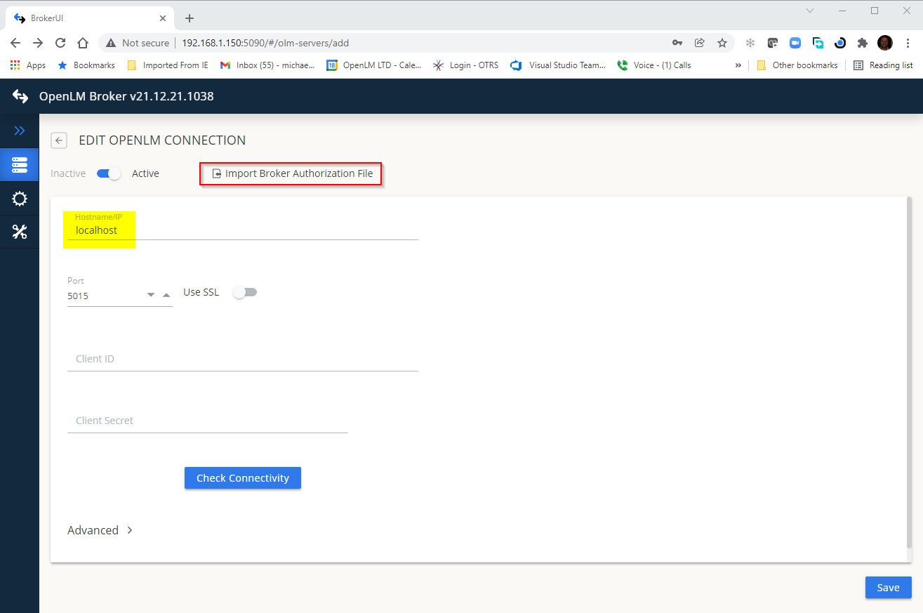 - Input the hostname of the OpenLM SLM or if you are using the Identity Service go to Start→Administration→System Security→Security→Authorization→Add and generate the authorization file. Import Broker Authorization File and click Save.