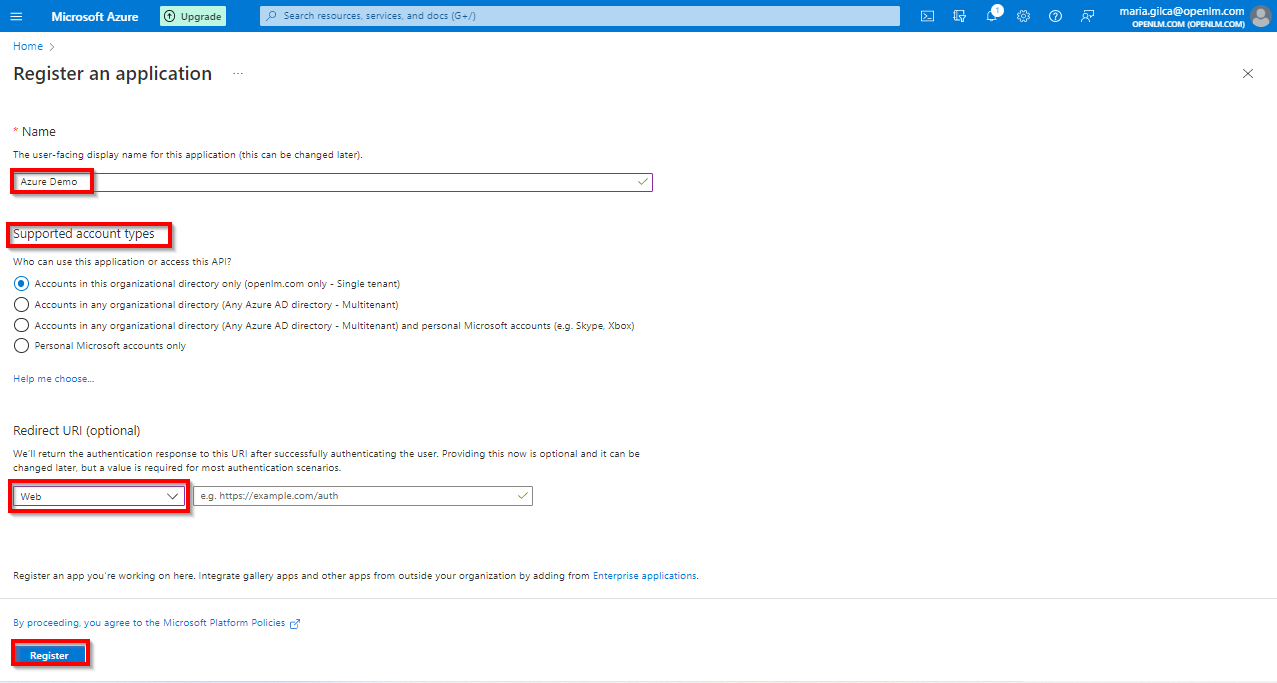 4. Provide the application display name (for example Identity Service). In the Redirect URI field, from the drop-down list select Web. Leave the URI field empty, as we will come back to this step and update it later during configuration. Click the Register button.