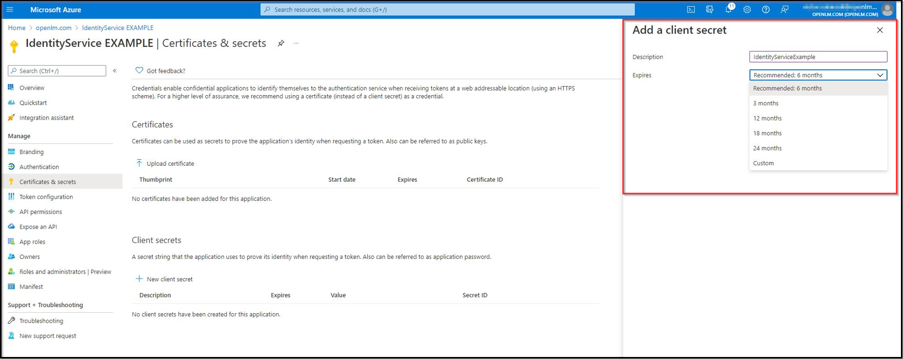 ! Client secret values cannot be viewed, except immediately after creation. Be sure to save the secret ID when created before leaving the page.