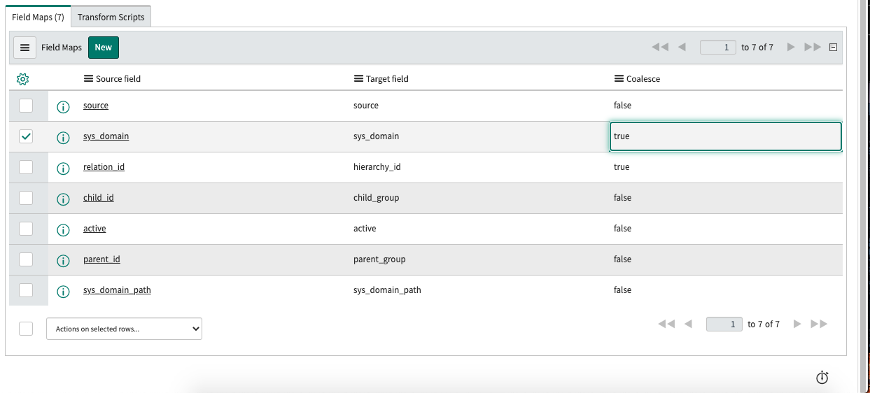 このスクリプトを実行したくない場合は、各ステージングテーブルに対応する Transform Map に移動し、以下の手順で sys_domain フィールドについて coalesce を有効にし、choice action を reject に設定します。
