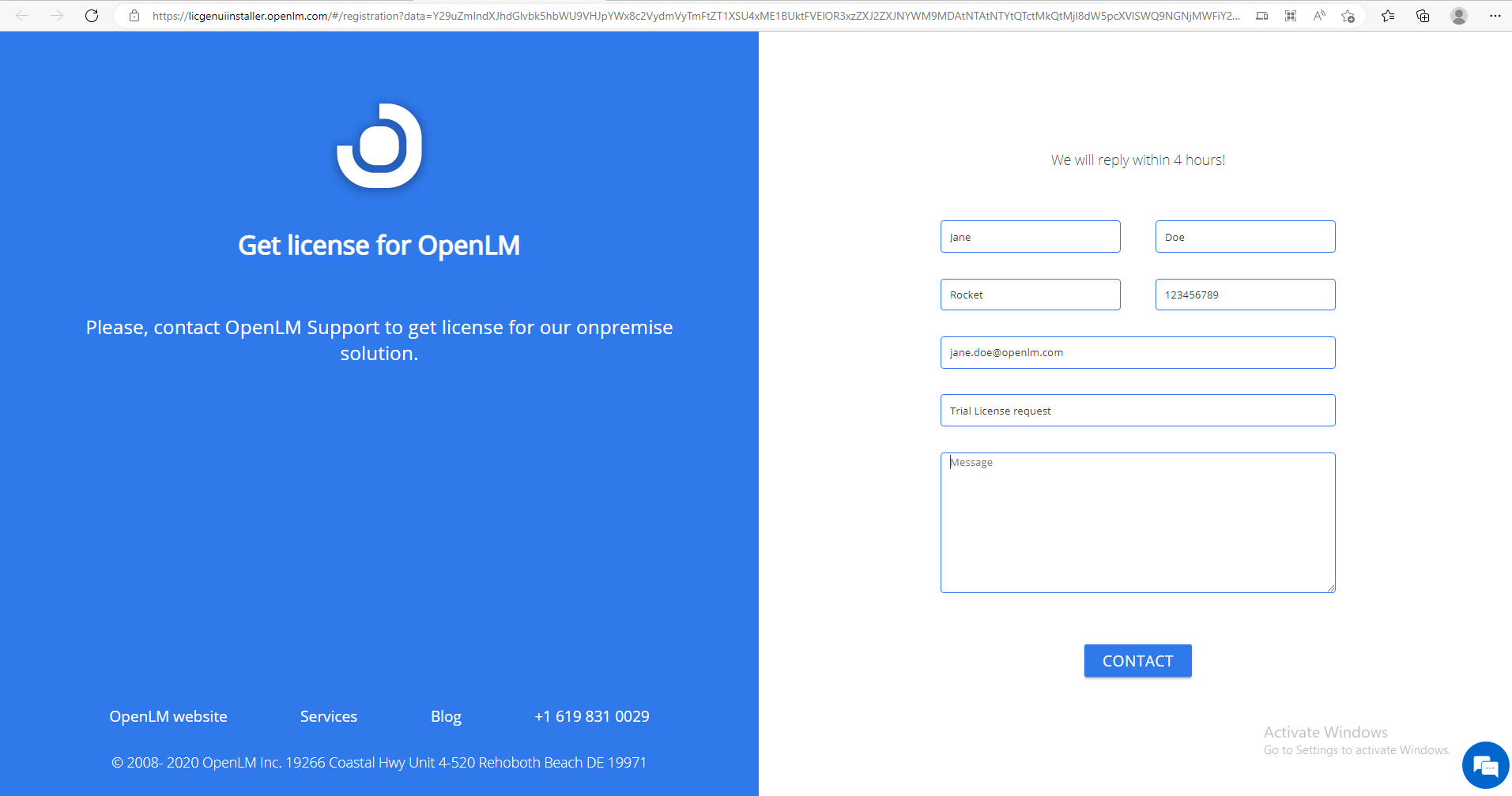 - Fill out the required fields (Company Name, First and Last Name, and Email) and click "Contact" to receive further details and the license file.