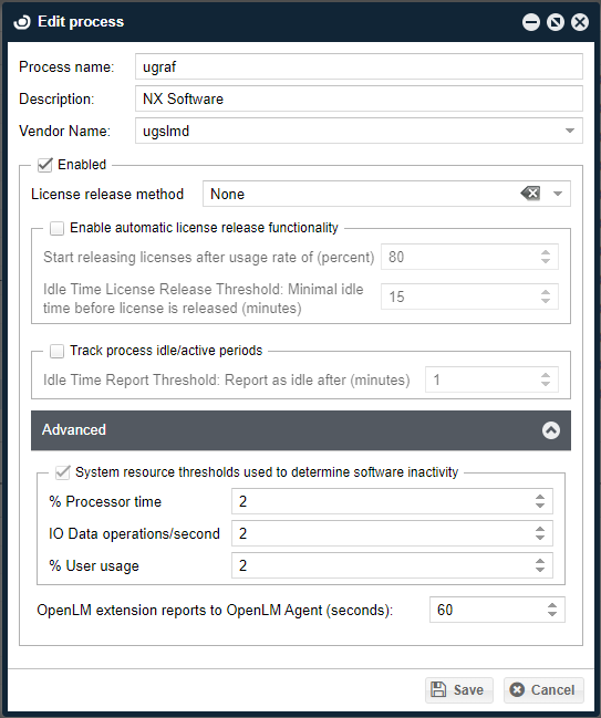 - Expand the Advanced panel and set the system resource threshold parameters. These numbers are thresholds used for determining whether the monitored application is idle. The shown default values should not be changed unless explicitly instructed by the OpenLM's support team. Changing these values inappropriately can harm the OpenLM system's performance.