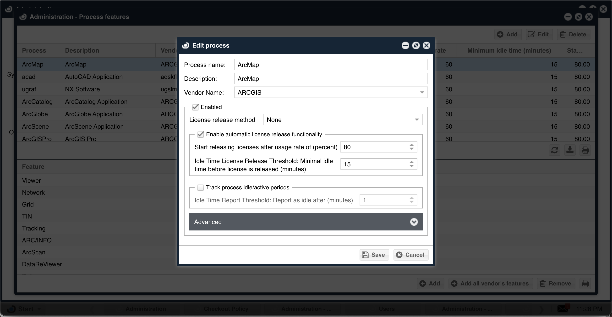 After completing the process described above in paragraphs 1 through 6, the Workstation is set to monitor the managed process. For software suites like ArcGIS that use the same license for multiple applications (e.g. ArcMap, ArcCatalog, ArcGlobe), these steps will have to be repeated with the same idle time values for each application that you want to control.
