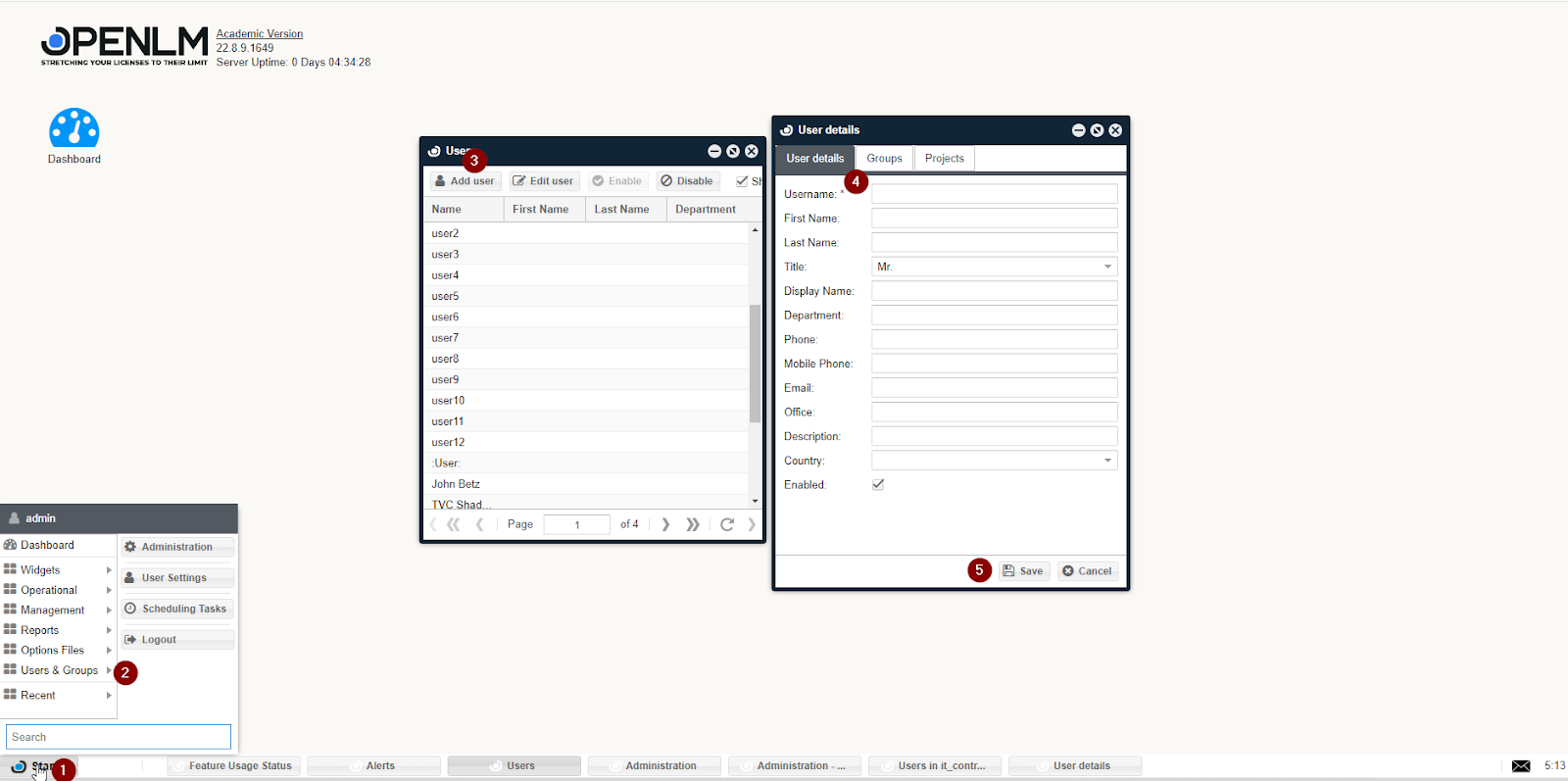 In order to assign roles to users, we should first make sure such users exist in the OpenLM database. The list of users is shown in the EasyAdmin 'Start' → "Users & Groups" → "Users" tab. Users can be added to the OpenLM database in a number of ways: