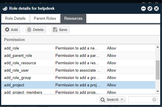 3. Select a resource (e.g. the add_project), and click the Select button. The "Role Details" window's Resources tab now appears with the newly attached "add_project" resource.