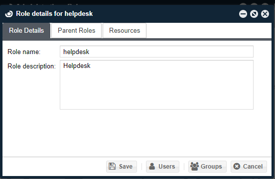 2. Select the new role (e.g. "helpdesk"), The Role details for help desk" dialog window appears.