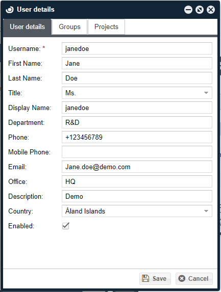 2. Click the Add User button. The User details form appears. Fill in the appropriate information items, check the Enabled box, and click Save as depicted below.