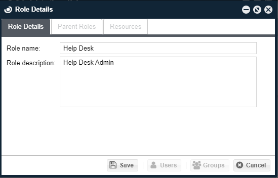 5. Click the Add icon, to add a role. The Role Details dialog window appears. Type in the role name and description (e.g. "HelpDesk" and "Help Desk Team" as they appear respectively in the image above). Click Save. Note that the new role name would be saved in lower-case format (i.e. "helpdesk"). Type in the role name and description (e.g. "HelpDesk" and "Help Desk Team" as they appear respectively in the image above). Click Save. Note that the new role name would be saved in lower-case format (i.e. "helpdesk").