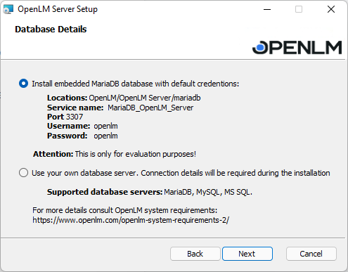 Choose your Database option:a. Install the embedded MariaDB (this is only for evaluation purposes):