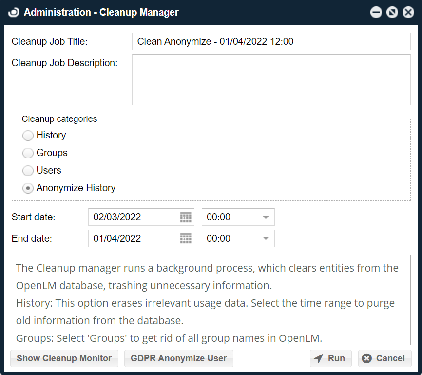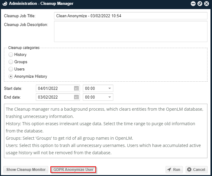 To anonymize the history of all the users for the selected period of time, go to Cleanup Manager and press the Anonimyze Users radio button. Choose a start date and an end date then click Run: