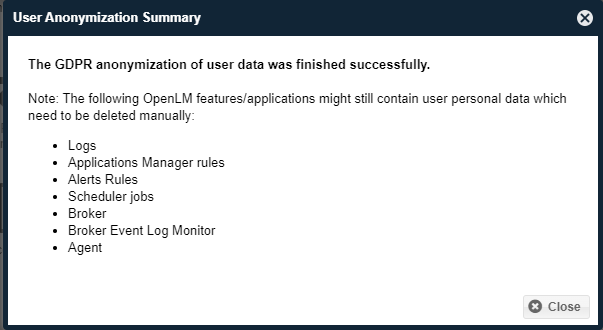Read the message in the User Anonymization Summary window and note that OpenLM applications/features might still contain personal data of users that will need to be deleted manually.
