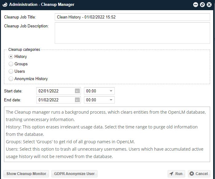 Cleanup Manager also allows the removal of irrelevant usage data (history). You can select a time range to purge old information from the database.
