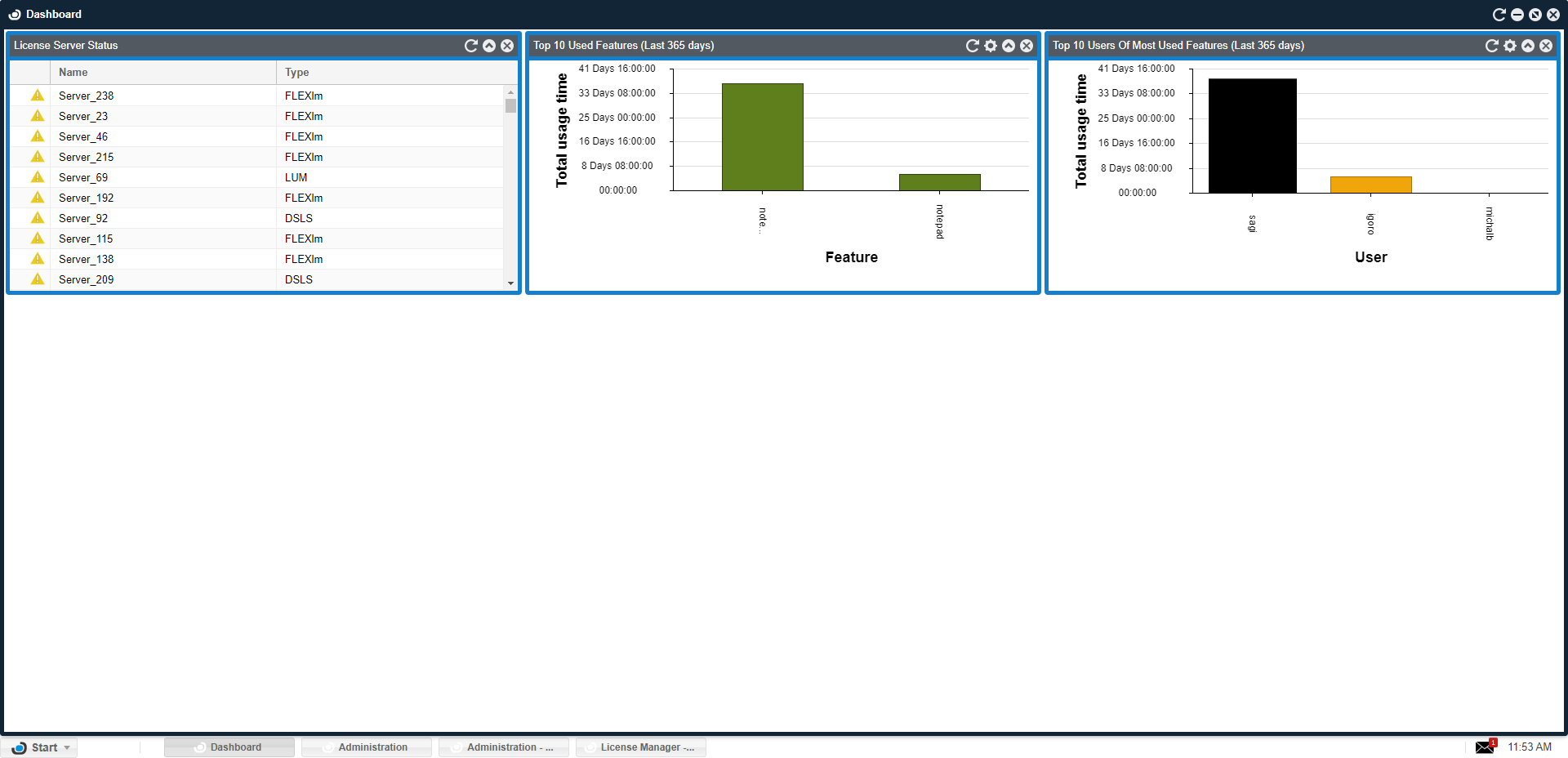 A popular widget with many customers is this Green-To-Red license utilization presentation of specified monitored features.