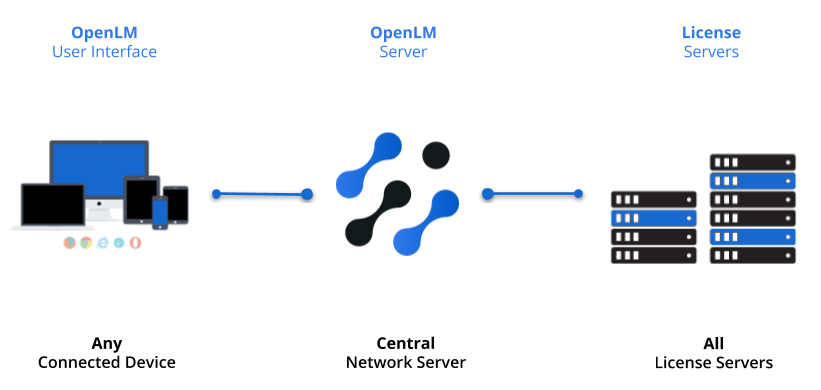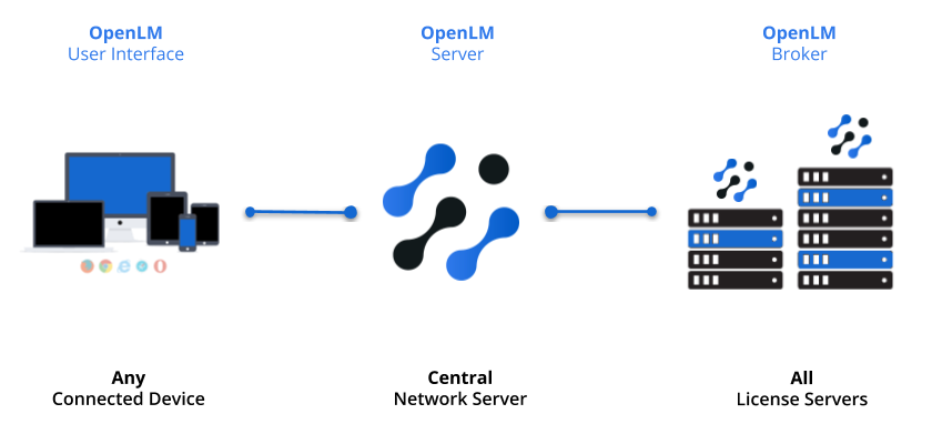 - 中央サーバーにOpenLM SLM、ライセンスサーバー自体にOpenLM Brokerがあり、FlexLMライセンスマネージャーのファイルと対話する必要があります。