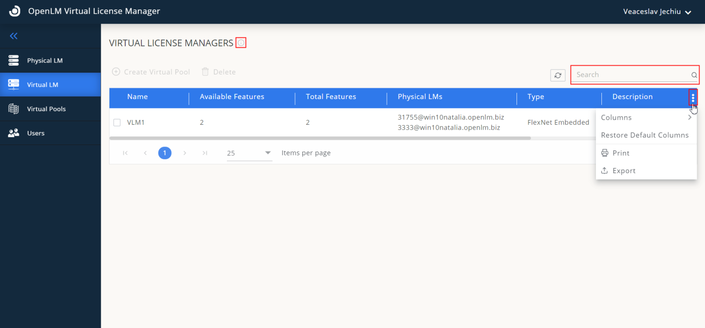 • You can manage columns, print, and export the table in the same manner as the Virtual License Manager table.