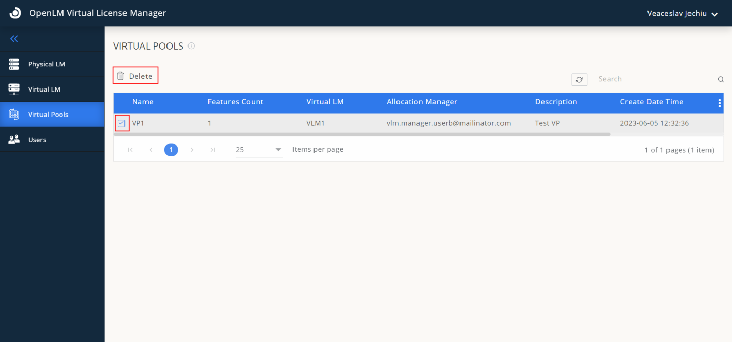 • The Admin can delete Virtual Pools. If a Virtual Pool is deleted, the quantity of licenses of this Virtual Pool is returned back to the feature of Virtual License Manager, from what it was created, increasing its value back to the number of licenses of Virtual Pool deleted, thus "Available Features" quantity is increasing back allowing that feature to be assignable to other Virtual Pool, in case that feature had 0 licenses before.