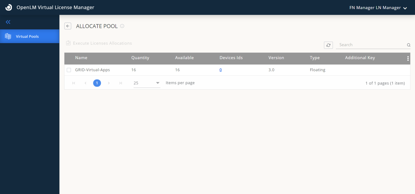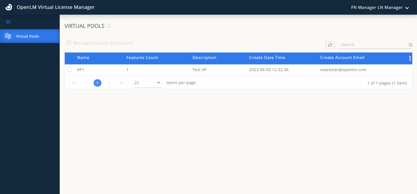 • A manager can manage license allocations of the Virtual Pool by selecting one Virtual Pool from the list of tables and clicking the "Manage Licenses Allocations" button.