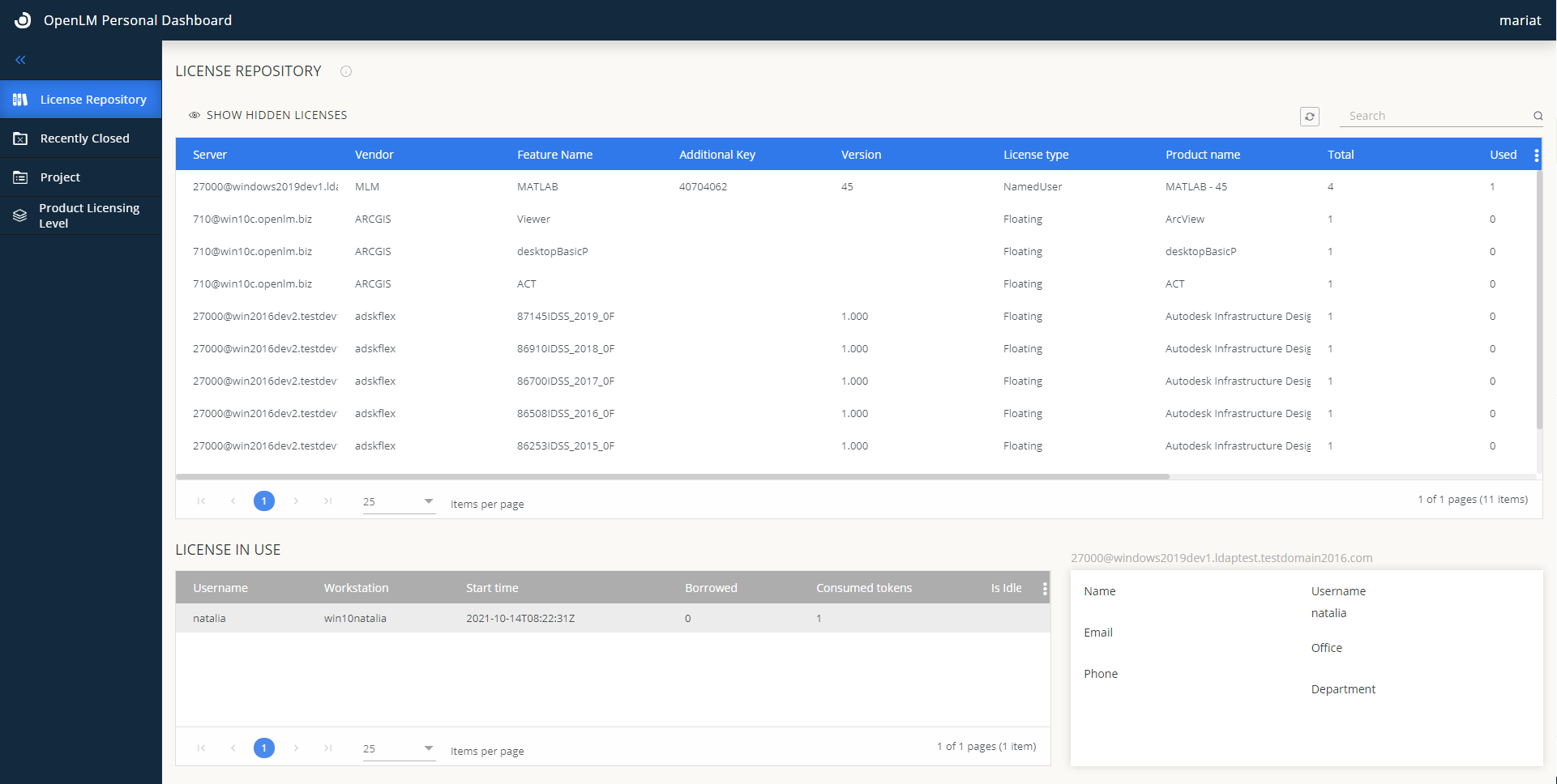 License Repository page