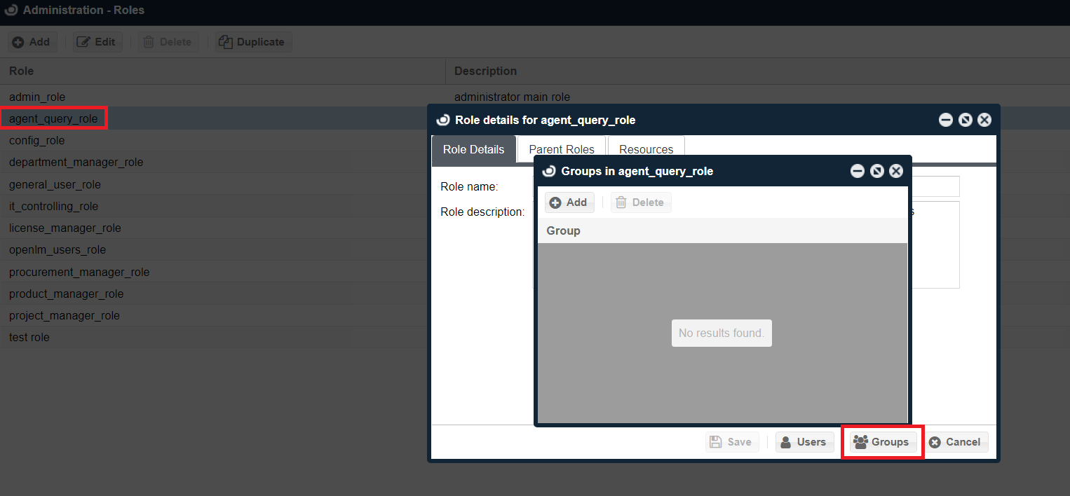 - Go back to Administrtation→Rolesand double click on agent_query_role→Groupsand delete OpenLM_Everyone group: