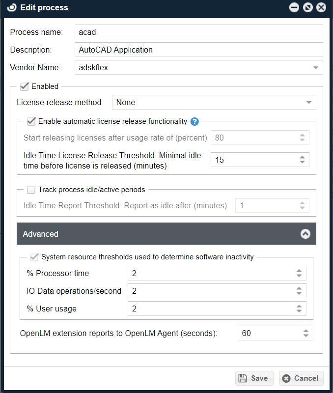 - Select the row with the Token Flex process/vendor (e.g. acad/adskflex) and either double-click on it or click Edit in the upper right corner of the window to open the Process Editor window.