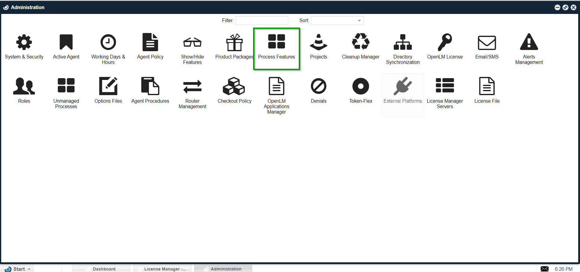 2. Navigate to Process Features. To do this click**[Start] > [Administration]** to open the Administration screen, then click on the Process Features icon (seeFigure 1). This will open the Administration — Process Features screen.
